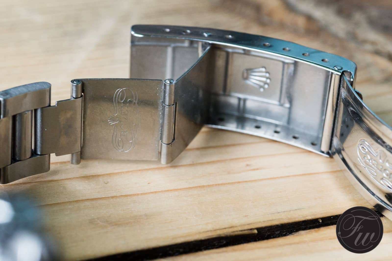 It has the flimsy but very useful diving extension which was the common one used in those days. The inside of the folding clasp bears, except the obvious ‘steel inox’ and ‘registered swiss made’ marks, R7 as date code.
