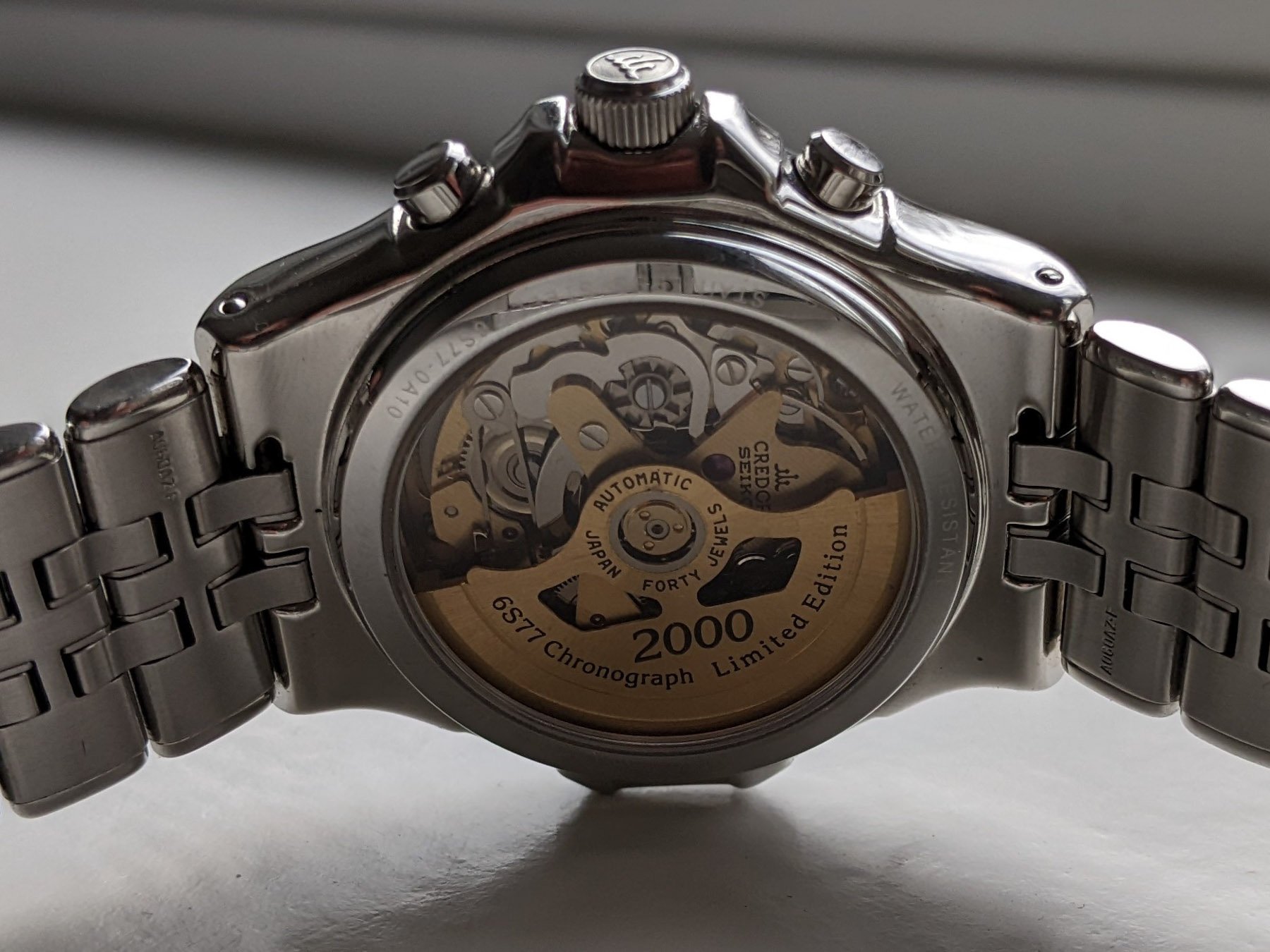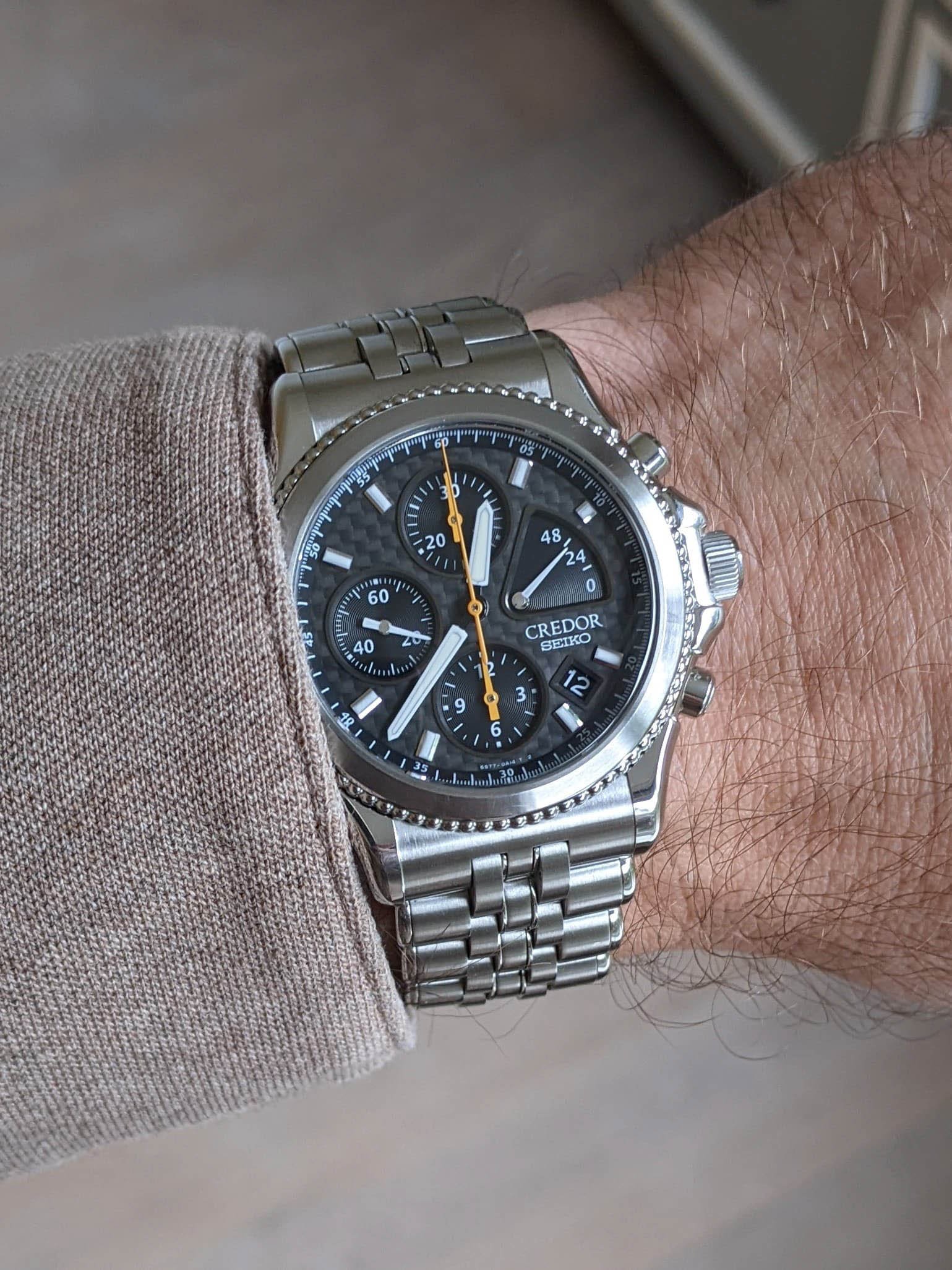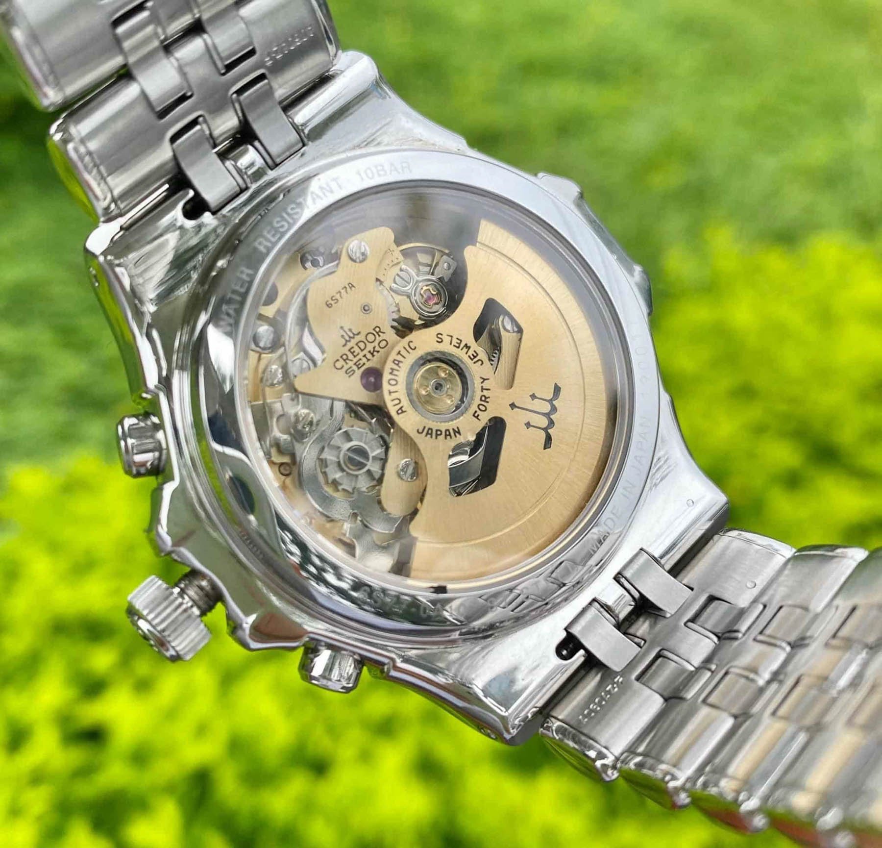 Inside the Credor GCBK99x series is the automatic Seiko 6S77 movement. Along with its chronograph function, it offers a date and a (somewhat obsolete) power reserve indicator. I’ll certainly stay on the lookout for these Credors because the one I saw that evening positively surprised me. Oh, and did I mention that there are also some two-tone versions out there?