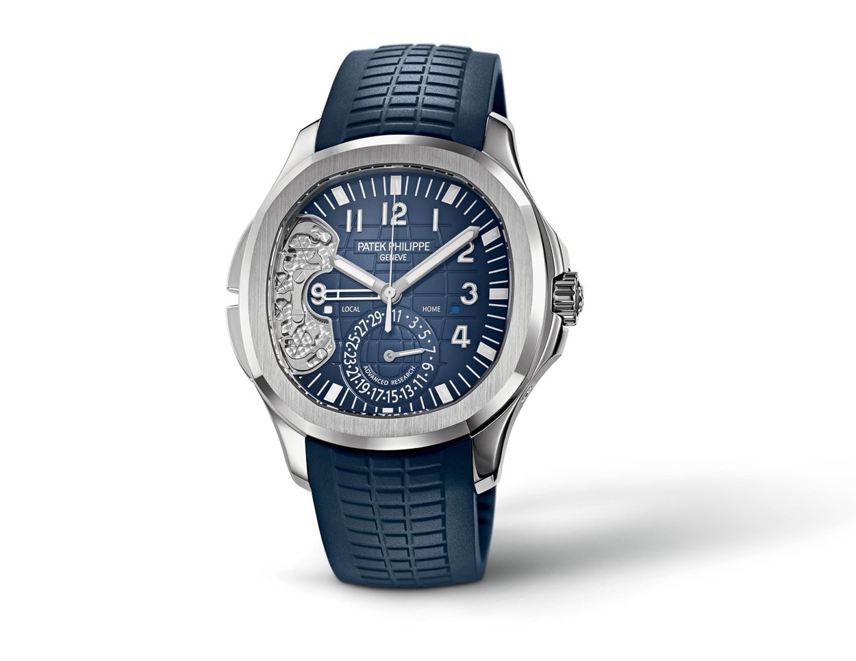 The Patek Philippe Aquanaut celebrates its 20th anniversary in 2017. The watch that commemorates this milestone — the Ref. 5650 Aquanaut Travel Time “Patek Philippe Advanced Research” — has an 18K white-gold case measuring 40.8 mm in diameter and 11 mm thick and water-resistant to 120 meters