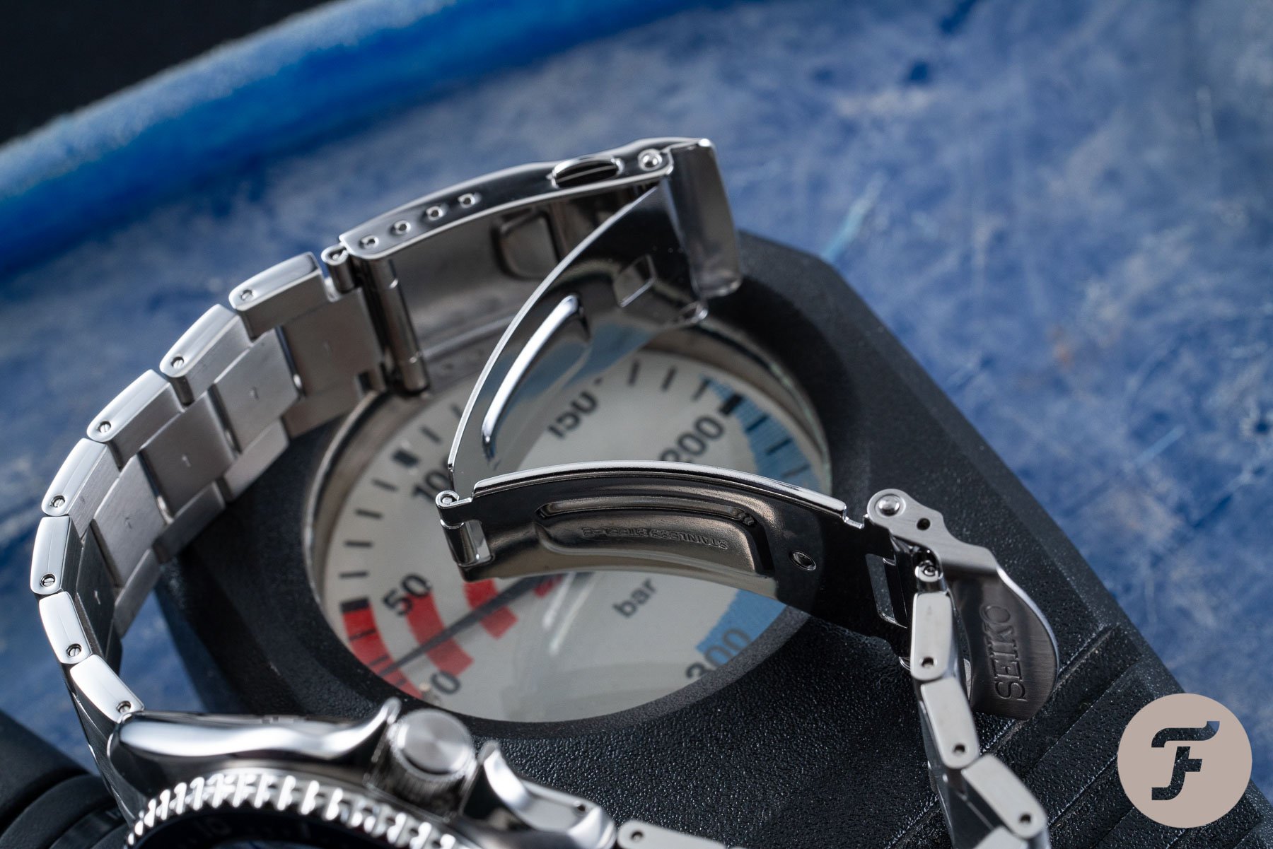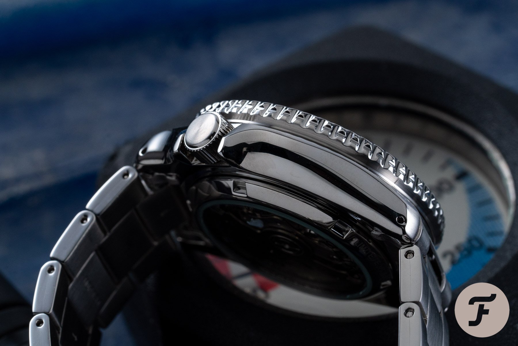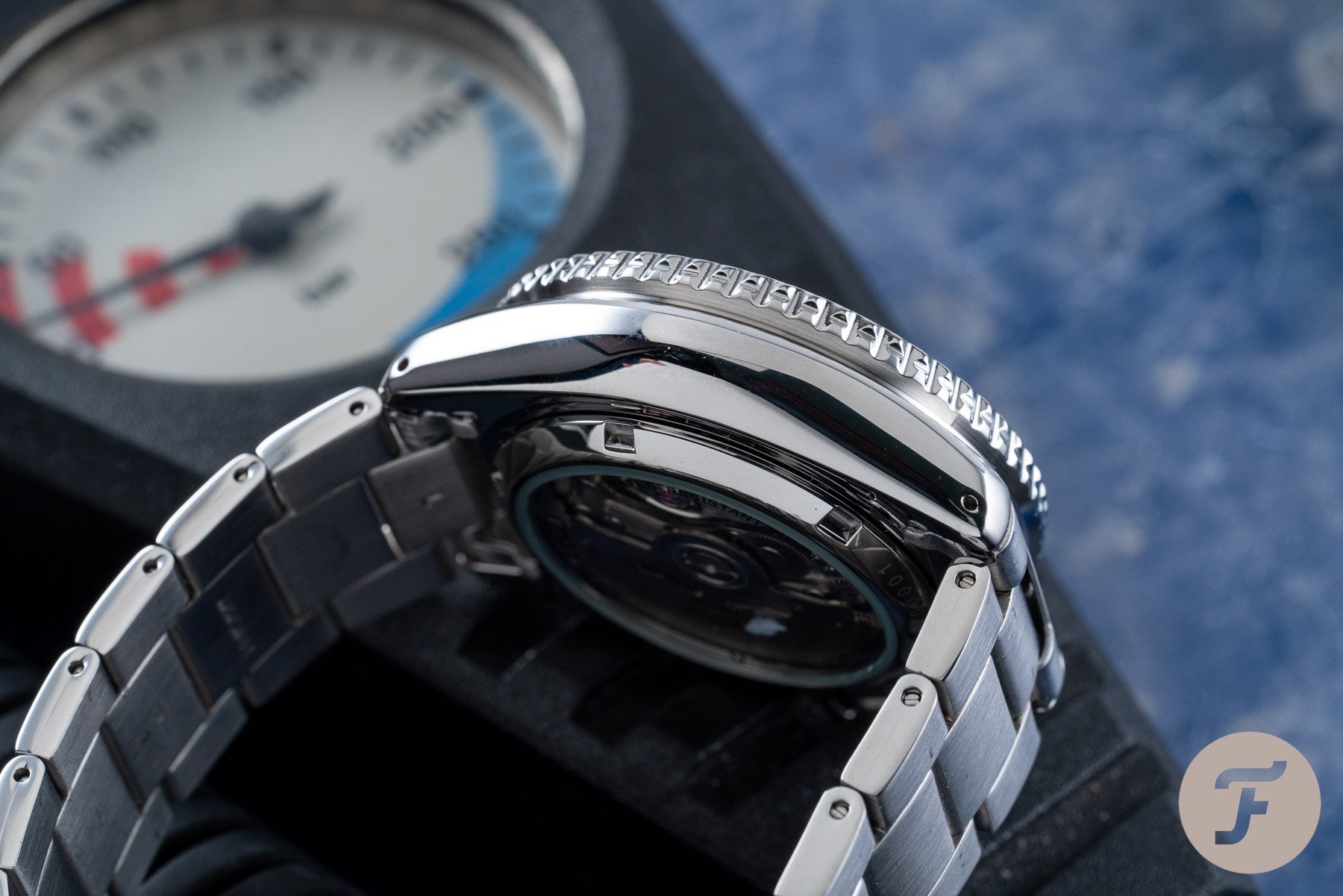 Although not a proper diver’s watch, the Seiko 5 Sports 140th Anniversary Limited Edition is still an accomplished all-around sports watch. It can handle 10 bar of pressure underwater, there’s a Hardlex crystal, a unidirectional rotating bezel, and a robust steel case with a screwed case back. The light green glow of the Lumibrite on the hands and indexes provides ample readability in the dark.